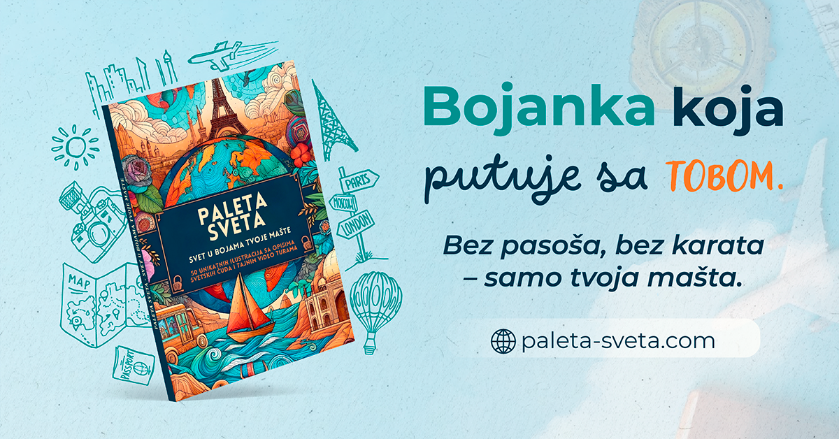 Paleta Sveta je jedinstvena turistička bojanka za odrasle koja ti pomaže da smanjiš svakodnevni stres, stimulišeš um, pojačaš fokus i poboljšaš svoje opšte emocionalno stanje.