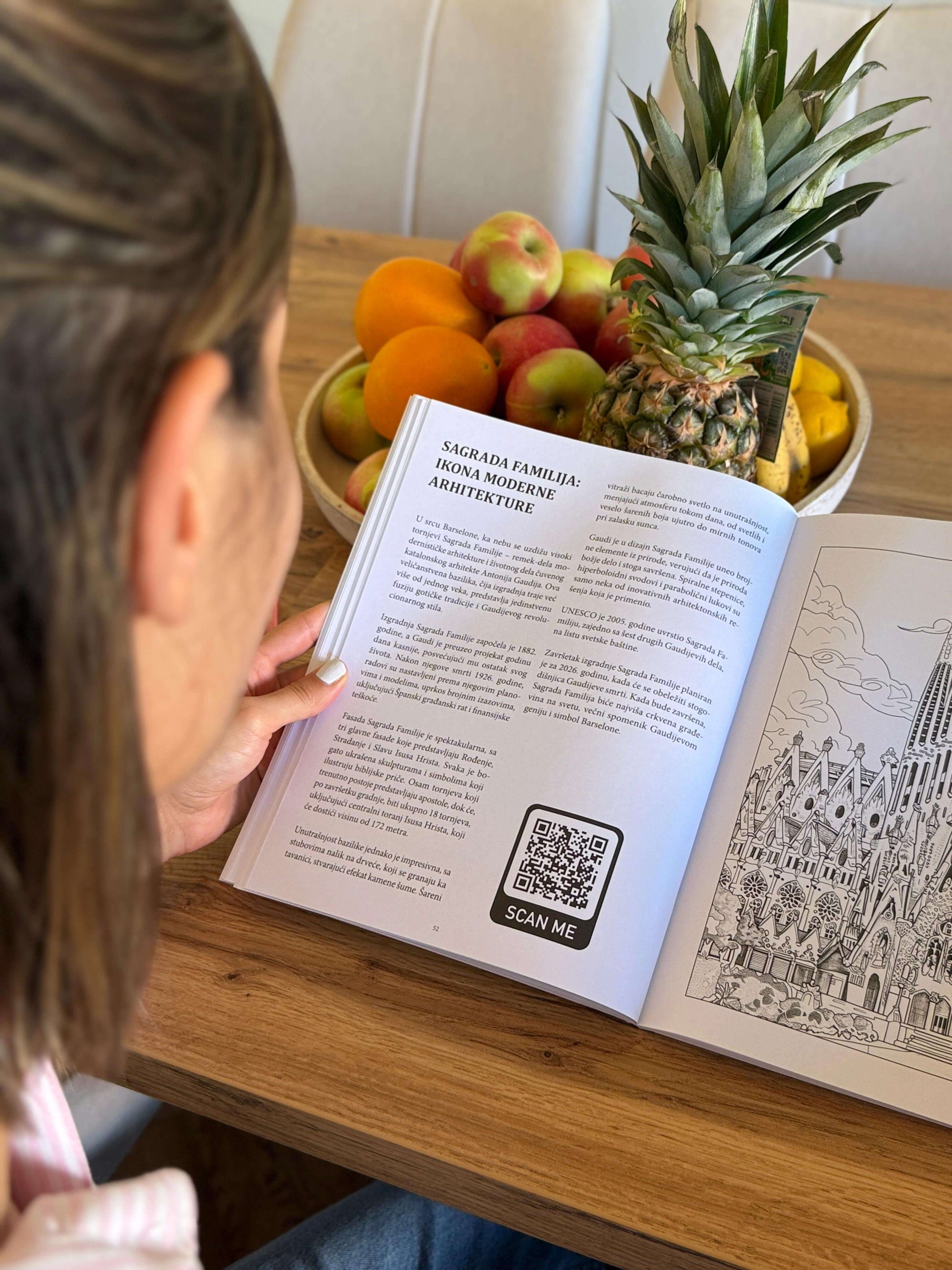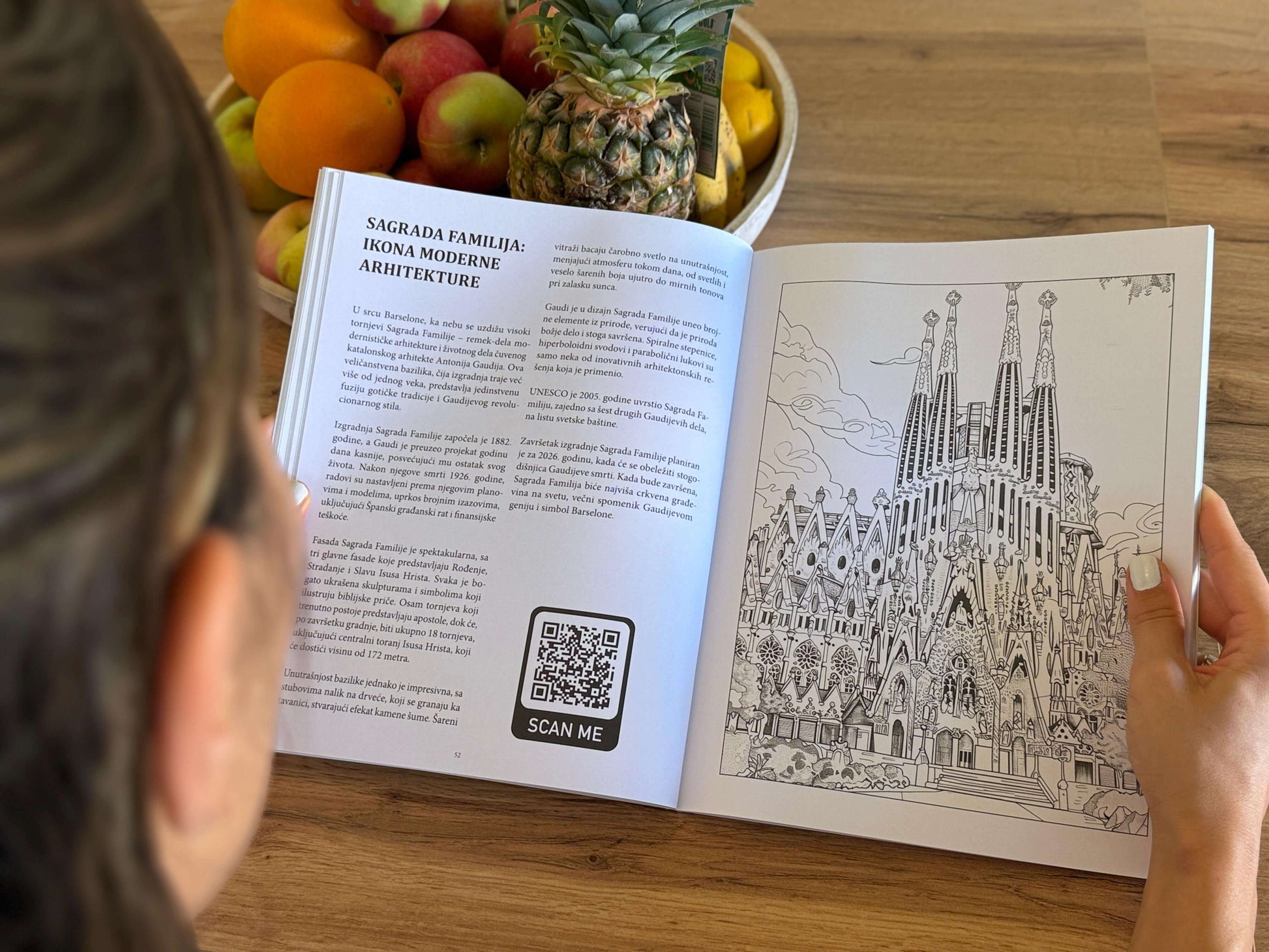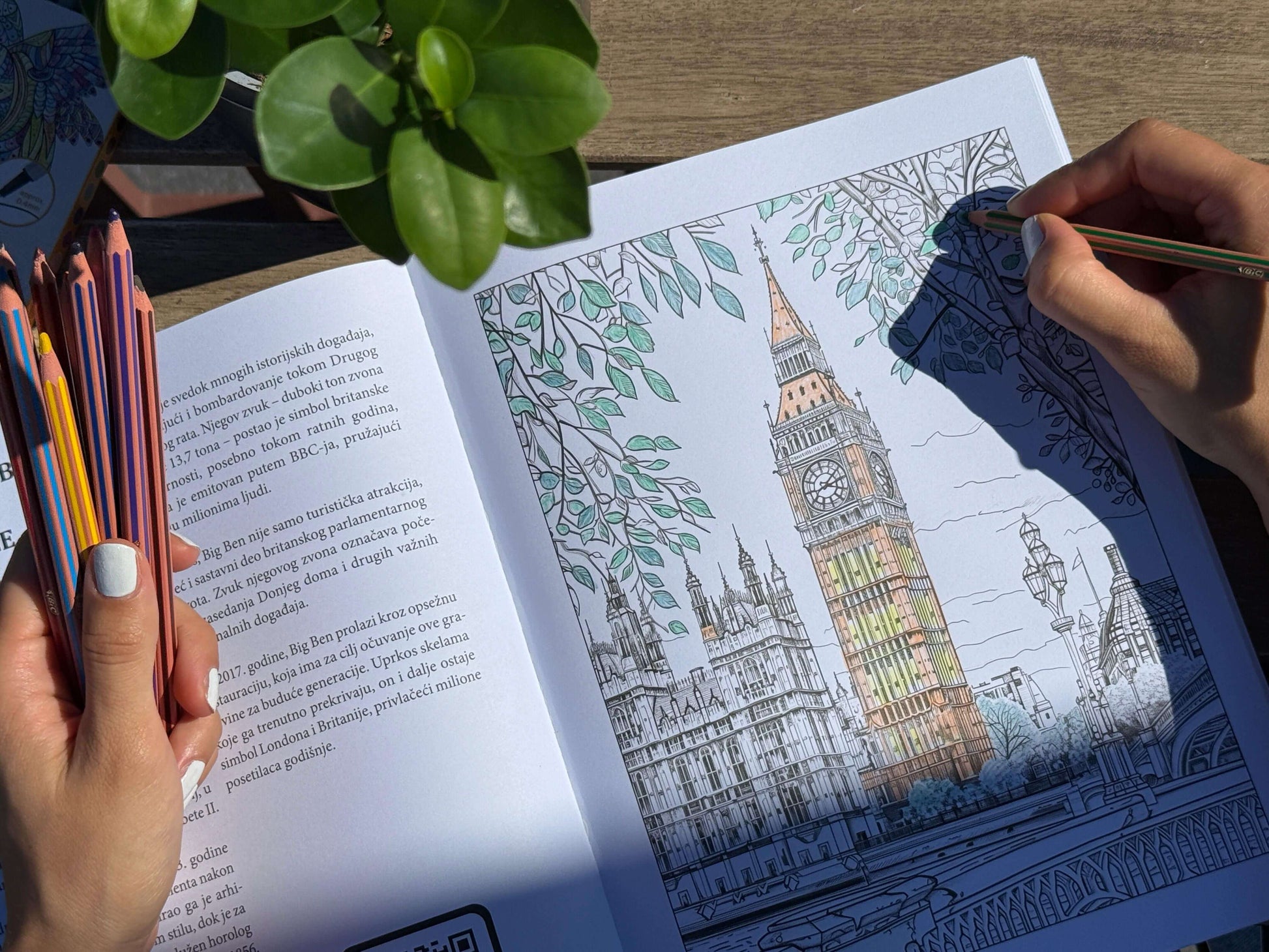 Svaka stranica, pored ilustracija, donosi zanimljive kulturne i istorijske činjenice o turističkim atrakcijama koje bojite.