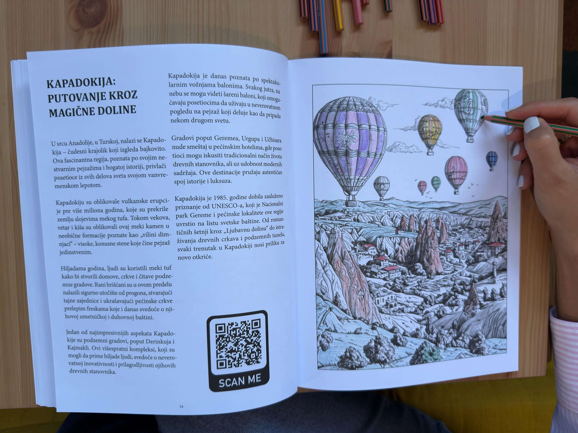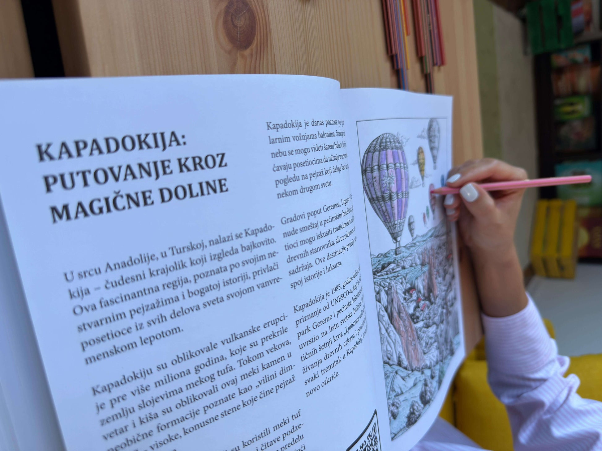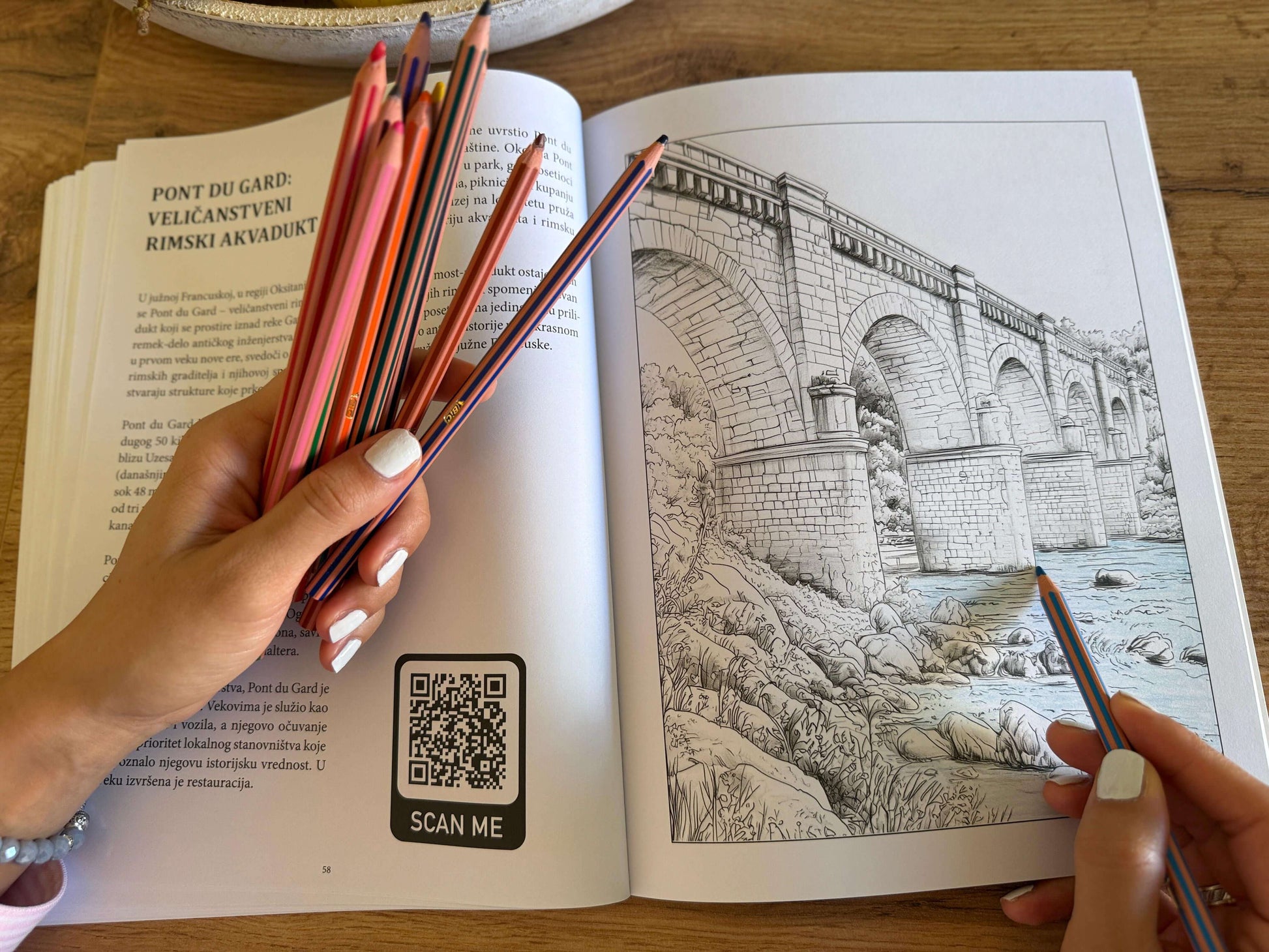 Svaka stranica, pored ilustracija, donosi zanimljive kulturne i istorijske činjenice o turističkim atrakcijama koje bojite.